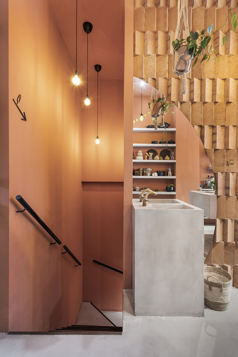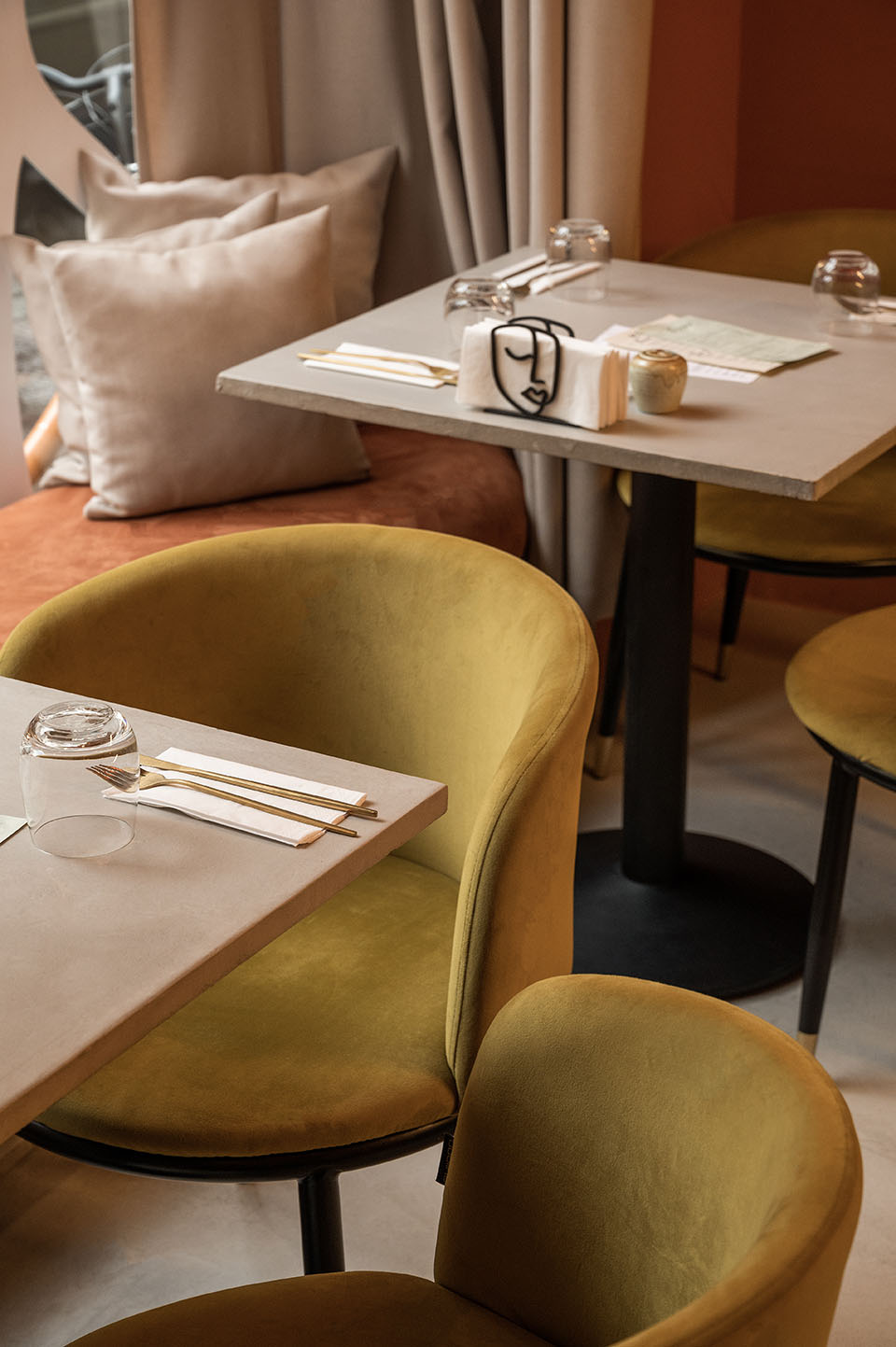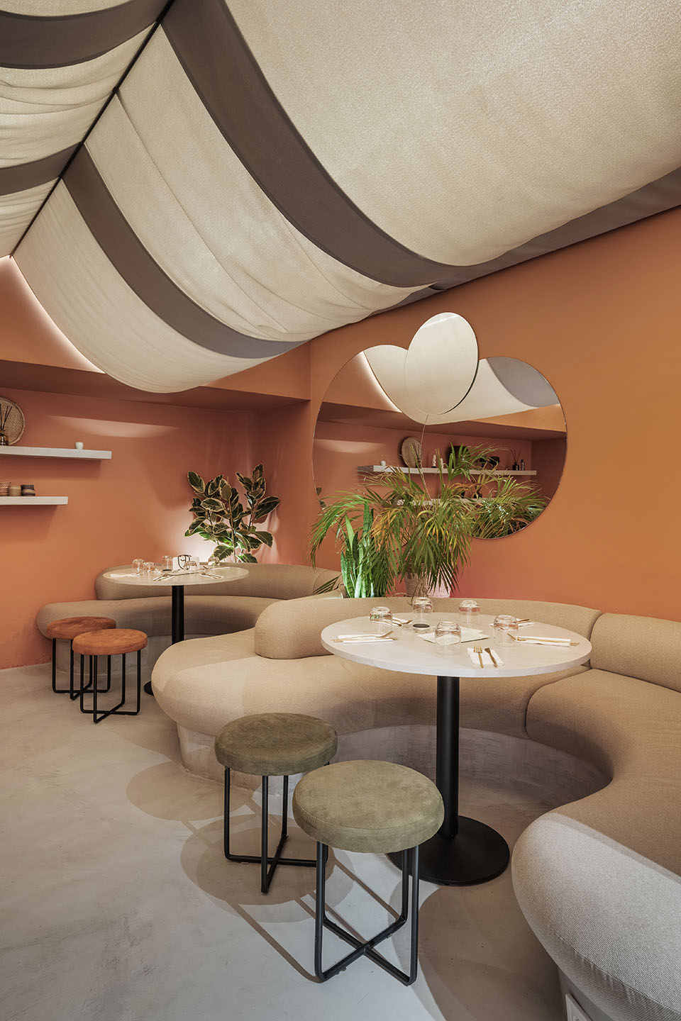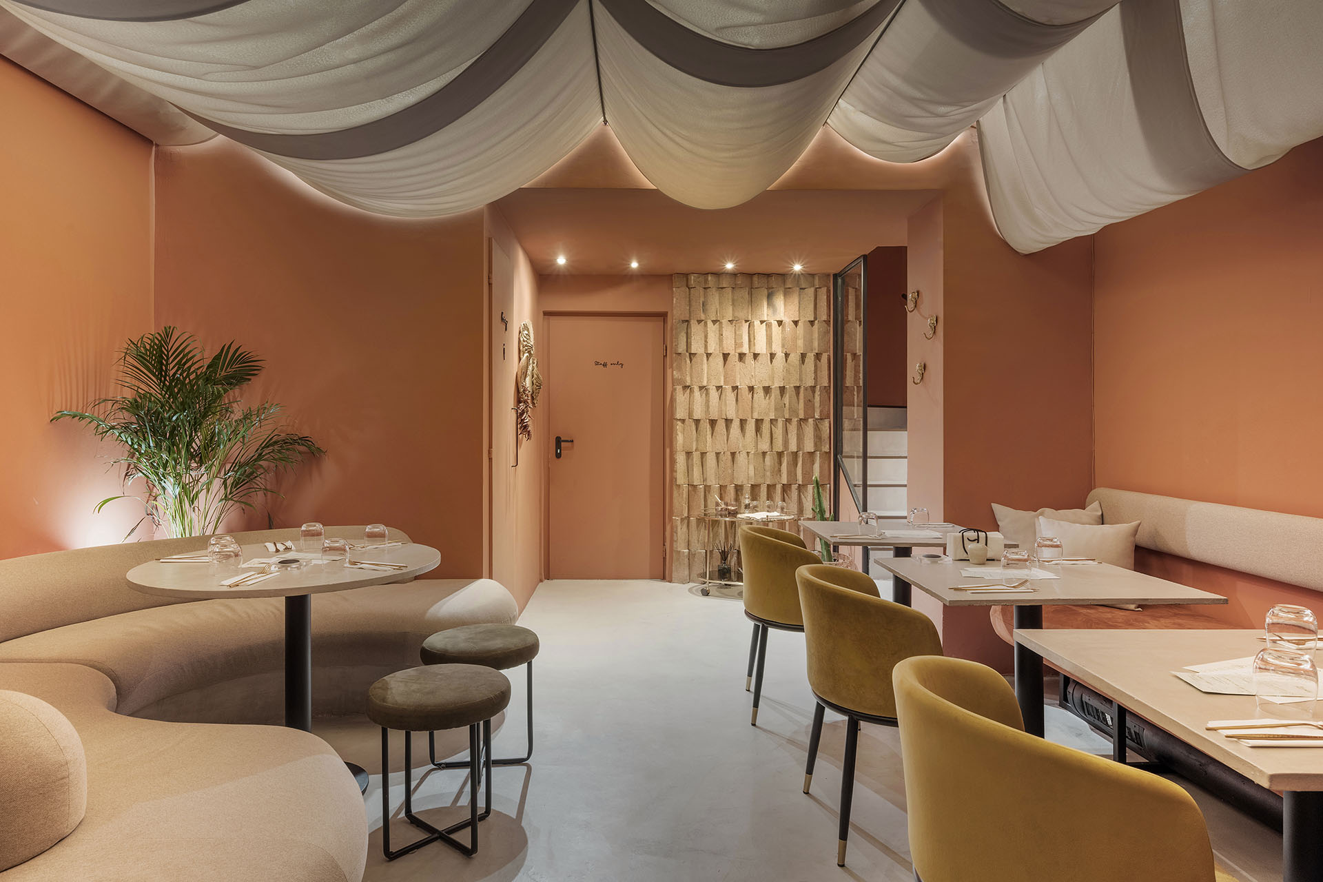 The distinctive terracotta walls at the front of the restaurant are complemented by hanging climbing plants, large mirrors, lime-colored furniture, and concrete-effect elements. The lower dining area provides an intimate refuge, where textile drapes cascading from the ceiling create a cozy shading effect in the space reminiscent of a cellar. The unique, organic-shaped sofa can be used for two separate groups or for a large communal meal. Noteworthy interior design solution is the three-dimensional brick wall appearing both upstairs and downstairs, which cleverly reinterprets the traditional building element with a creative twist.